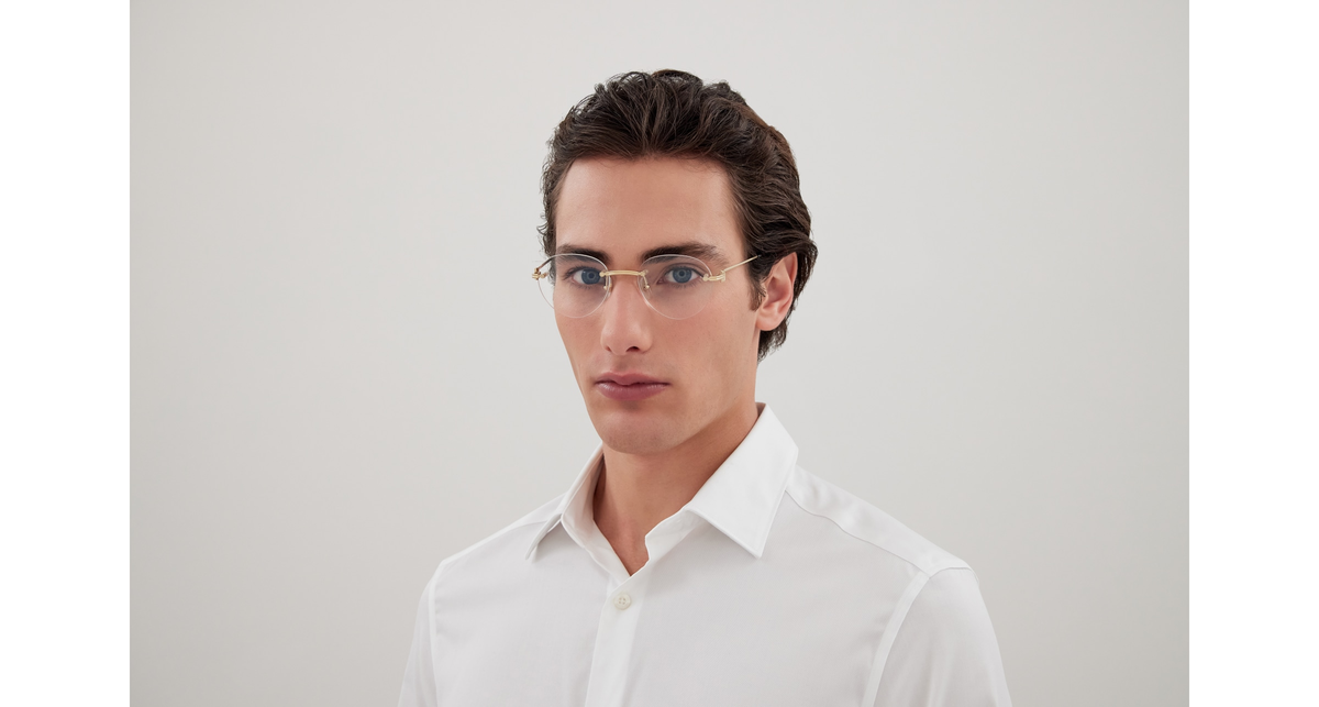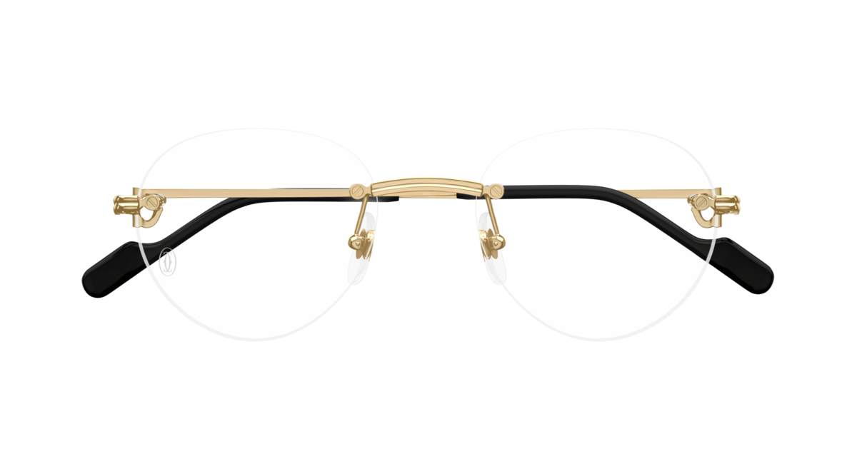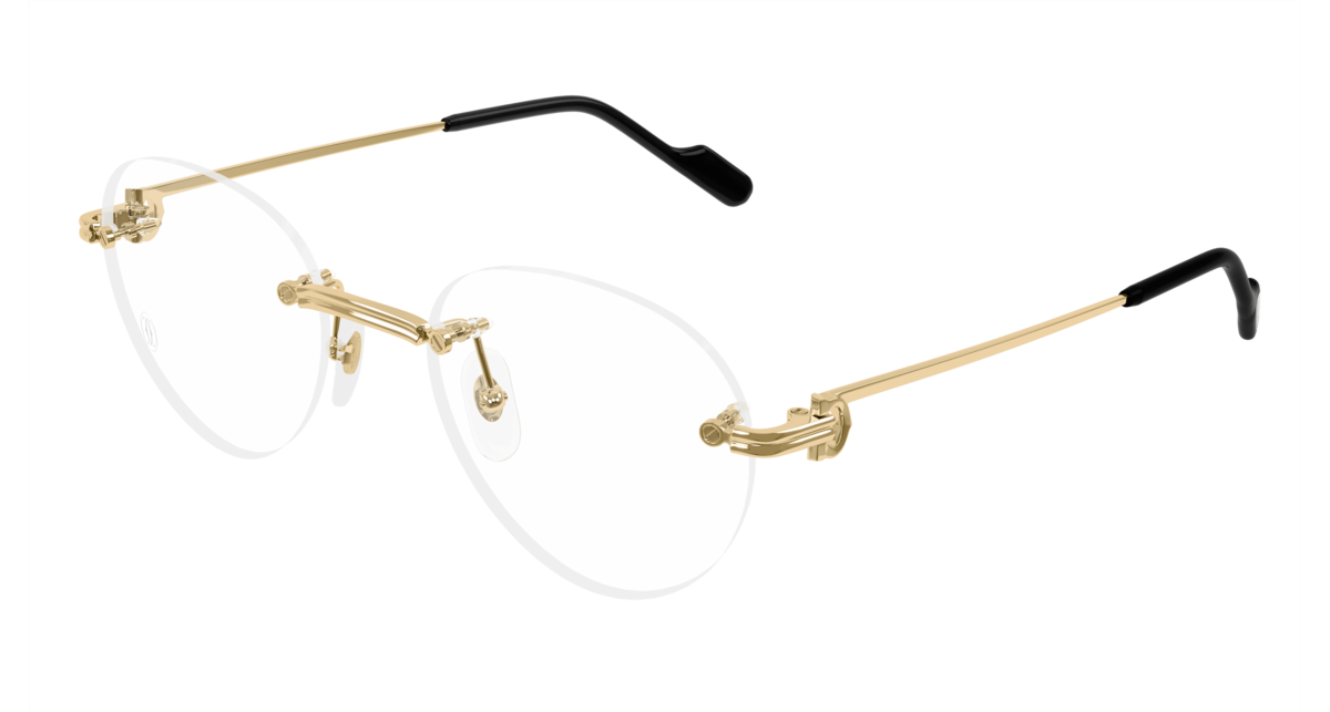 Cartier CT0514O, neue, leichtere Version des Metallrahmens Première de Cartier, die sich durch die edlen und feiner gehaltenen Godron- und C de Cartier-Details auf dem Scharnier auszeichnet. So entsteht ein alltagstauglicher und doch unverkennbarer Look. Runde Unisex-Form mit rahmenloser Konstruktion sowie leichten Metallbügeln. Ein edles Gold- und Platin-Finish, die Cartier-Logoplakette auf den Bügelenden aus Acetat und der Double C Décor auf den Nasenauflagen runden das Modell ab. Verglasbar in deiner Sehstärke.